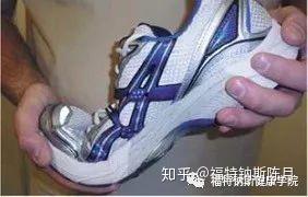通过将鞋子的两端固定并弯曲来执行此测试。鞋子只能在脚掌的前三分之一处弯折。如果鞋在中间弯折,则稳定性会降低。细心的读者应该已经注意到了,这里建议的跑鞋的弯折点和我们之前提到的脚掌的自然弯曲点所吻合。换句话说,我们应该尽量选择能在脚掌自然弯曲点附近弯折的跑步鞋而不是能在足中处弯折的跑步鞋,因为后者会给足底筋膜造成额外的拉力。