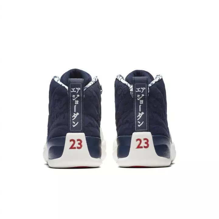 这款AJ 12 的灵感源于1996年,乔丹前往日本东京,与其他NBA球星一起参加的一场友谊赛,因为当时所穿的就是AJ12,所以在鞋面上加入了日本浮世绘风格的图案纹理,并在后跟增加了“Air Jordan”的日文字样,而云纹与鱼鳞设计巧妙体现出鲤鱼旗灵感,更将日式风格凸显。