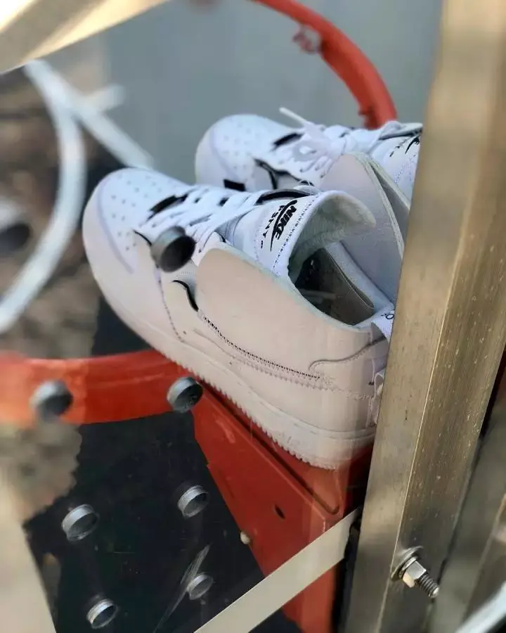 这款Air Force1 鞋在其侧面切断样式的 Swoosh 为这款简单的黑白款增色不少,后跟的 Logo 罗列再次说明了 Supreme 的设计理念。