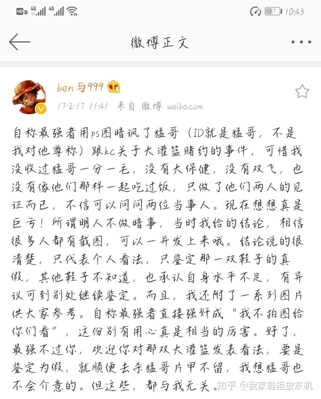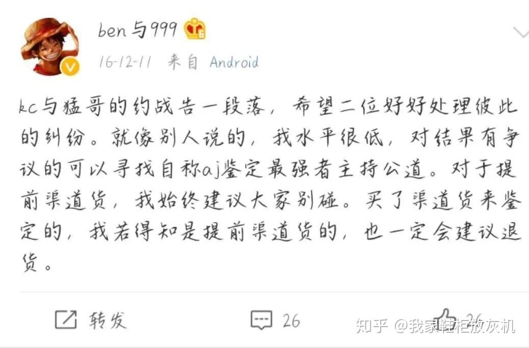 当时KC因为说猛哥的提前货AJ11为假货,而猛哥说是真的,在双方僵持下,而且虎扑大神们各持不同意见,对此鞋结论难以统一,在这时候,ben999出来说当裁判,让猛哥把鞋子寄到ben999手上,实物鉴定后ben999表示没有看出问题,所以这双鞋就默认为真,KC打赌结果是KC输了。