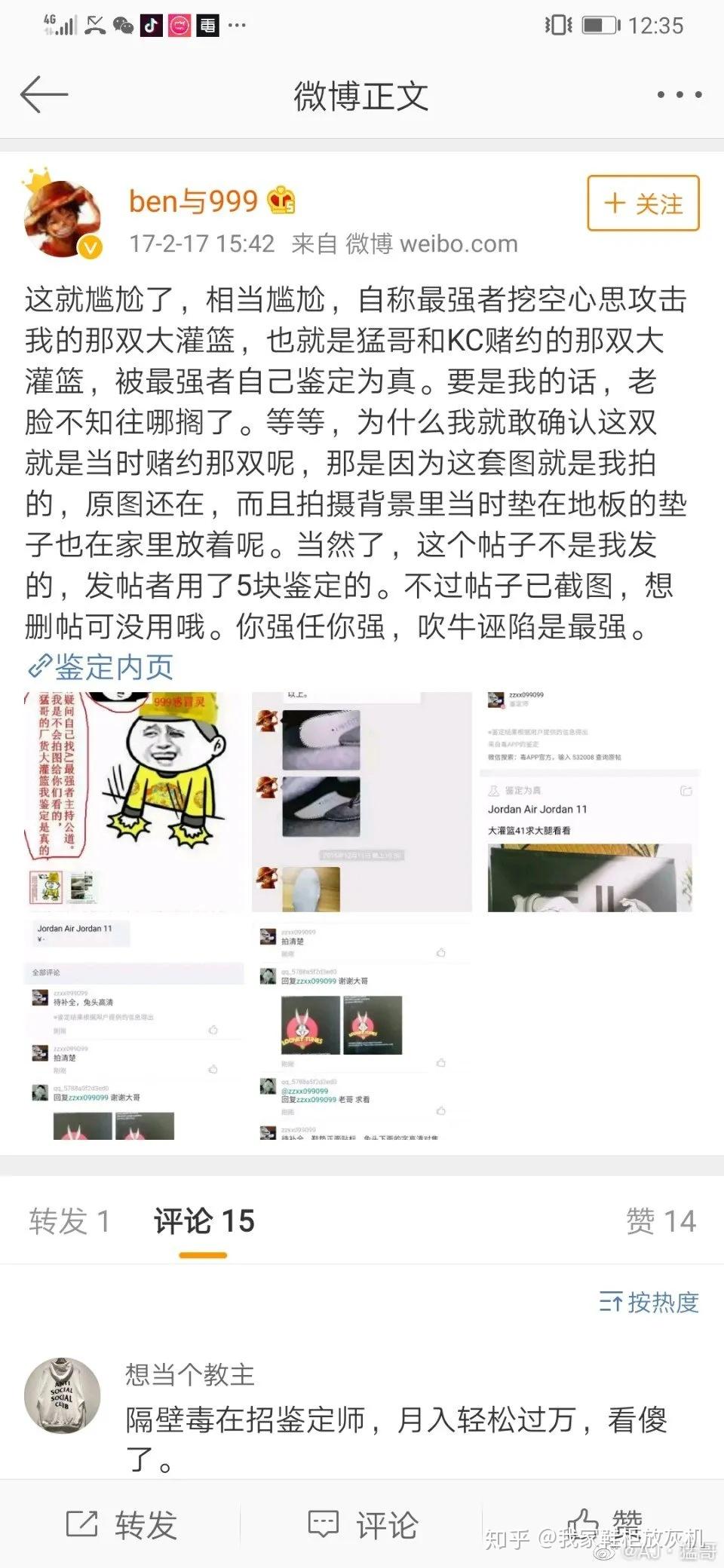 最早一次猛哥和鉴定师发生冲突是在2016年年底,鉴定师KC和AJ猛哥关于一双来自猛哥的有盒提前货AJ11大灌篮真假的而争吵,当时因为这双AJ11提前货真假在虎扑论坛争得不可开交(没有平台前主要鉴定是在虎扑论坛),因为是提前货,而且是网上的图,所以都会影响鉴定准确性。(在事情结束后,虎扑把相关贴子全部删除了)