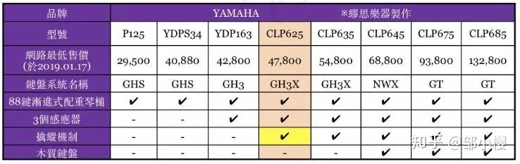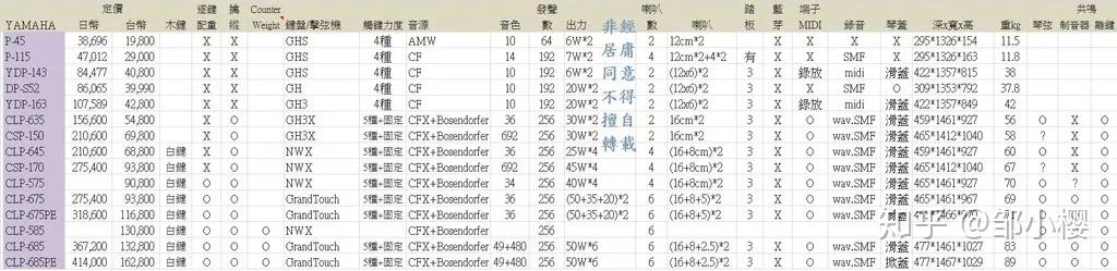 此前的CLP 525、CLP 535推崇者很多,后来雅马哈把其升级到CLP 600 series,最新的价格(台币)和技术指标,盗一张台湾老师的图: