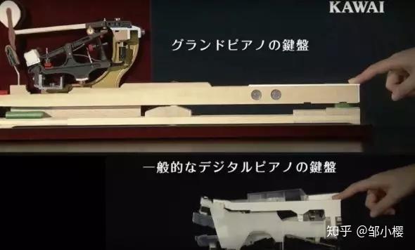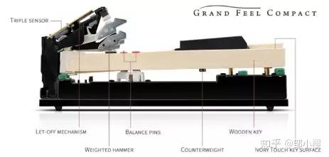根据杠杆原理,键盘到支点的距离越长,手感越细腻,上图能看到传统钢琴、GRAND FEEL II技术电钢琴还有一般电钢琴的对比。你看施坦威三角钢琴为啥要这么大,深度为啥这么夸张,但是为什么立式钢琴、电钢琴深度可以做到这么小,这也是其中一个项理由。