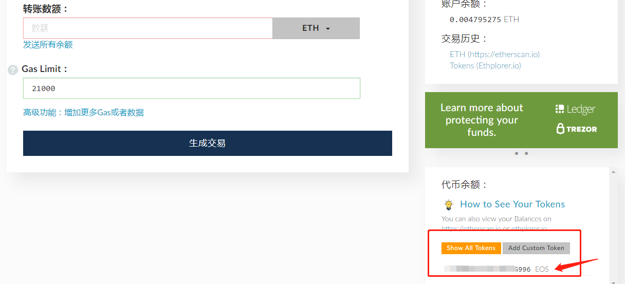 转账数量: 下拉选择EOS,如果下拉没有,到右边【Token Balances】--【Show All Tokens】找到eos,点击【Click to Load】