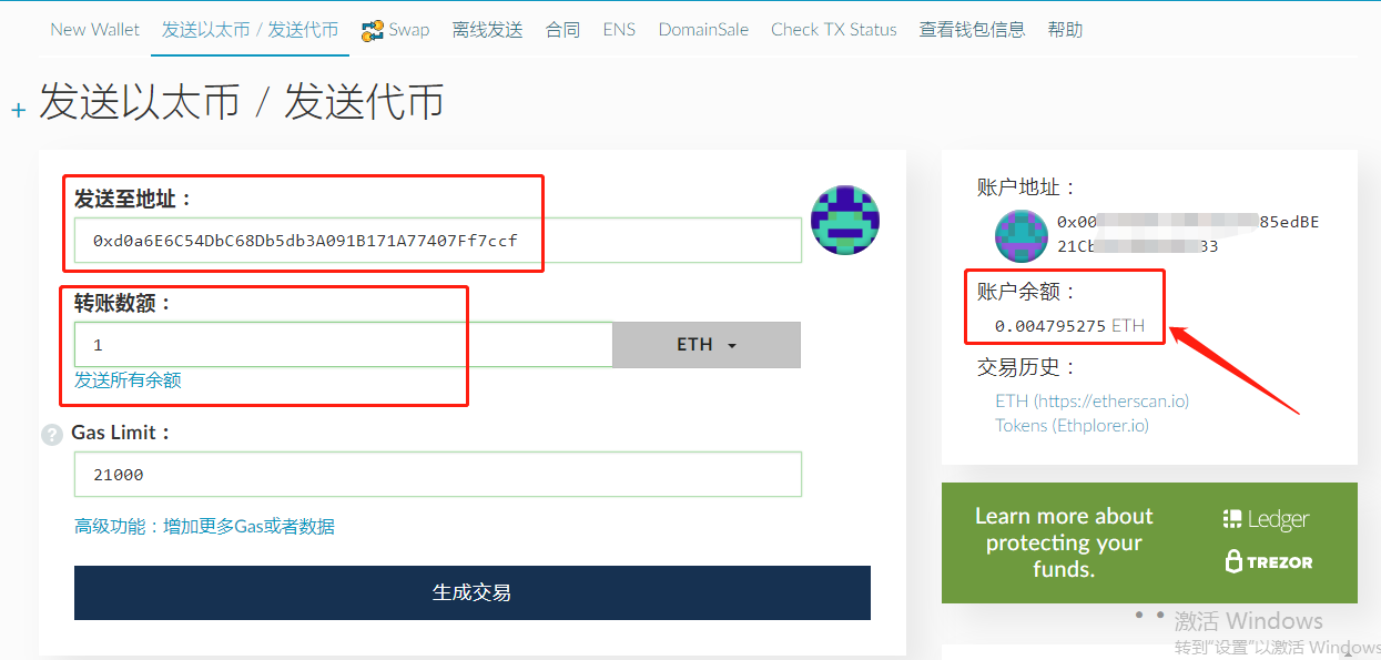 转账数额:需要注意千万不要把全部ETH转去众筹,根据我的经验,至少预留0.007eth用于后面提取eos和转账eos的手续费!!!