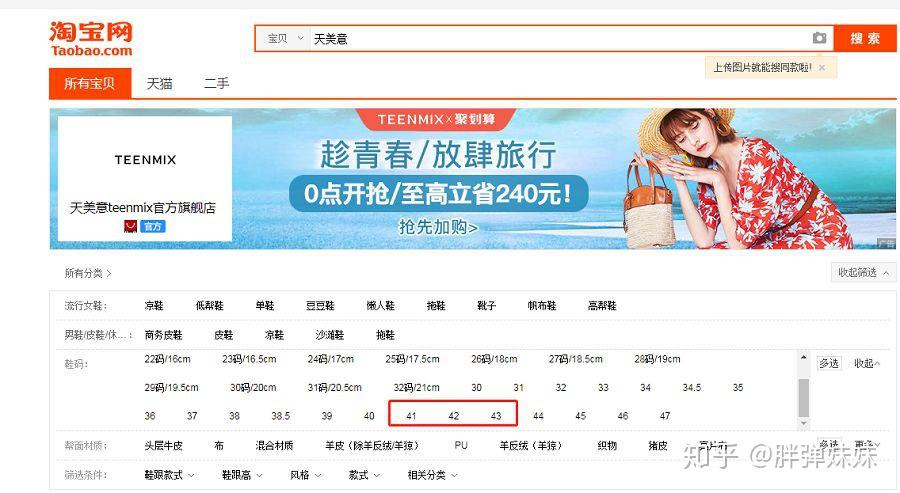 在网页版搜索栏中输入自己喜欢的品牌(这里我搜“天美意”),如果在鞋码中有"41"或以上的码数,这个品牌很大概率就会有定制大码鞋的服务。点击41,选择定制鞋款。