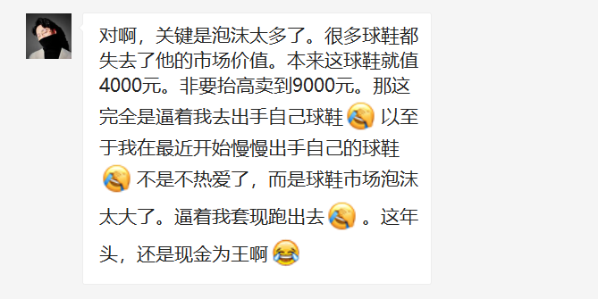 他还说,对他个人来说,其实不是炒鞋人,不是鞋贩子,他只是单纯喜欢而已,个人纯收藏,不倒卖。而最近卖的,也无非是想换双更好的球鞋。然后,感觉鞋子泡沫涨幅有点大,赶紧抛了,等球鞋价格下来后,再买自己喜欢的球鞋收藏,他不以这个为生活,纯个人爱好,买的球鞋,不穿,放在家里摆放,供着欣赏。
