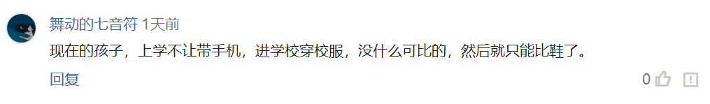 网友@舞动的七音符:现在的孩子,上学不让带手机,进学校穿校服,没什么可比的,然后就只能比鞋了。