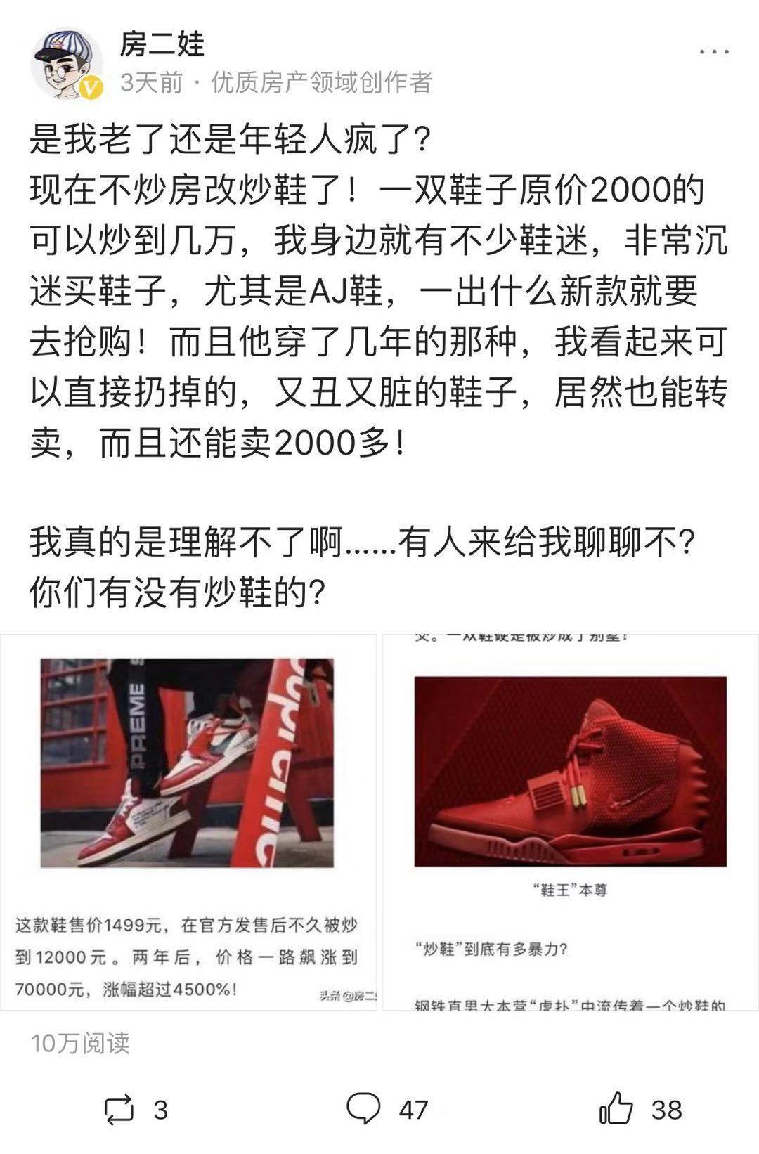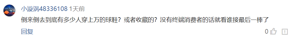 网友@小漩涡:倒来倒去到底有多少人穿上万的球鞋?或者收藏的?没有终端消费者的话就看谁接最后一棒了。