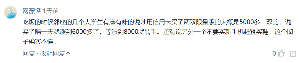 网友@网漂怪:吃饭的时候邻座的几个大学生有滋有味的说,才用信用卡买了两双限量版的,大概是5000多一双,说买了隔一天就涨到6000多了,等涨到8000就转手。还劝说另外一个不要买新手机赶紧买鞋!这个圈子确实不懂。