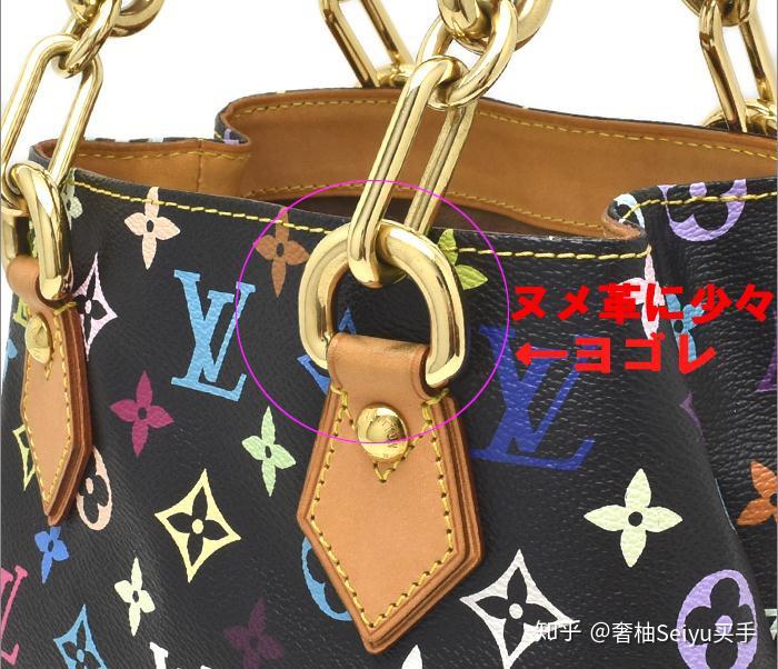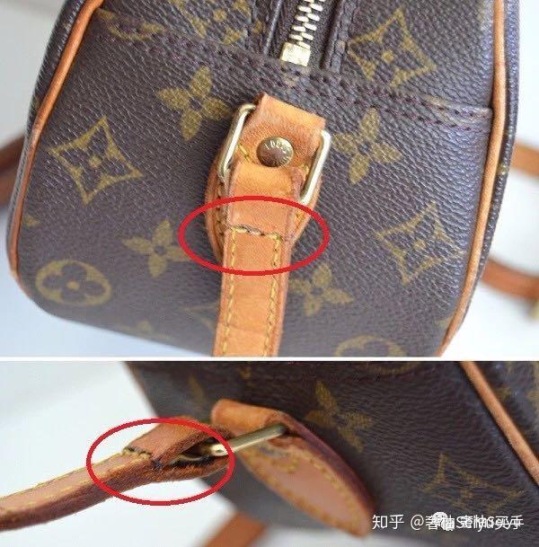 除了走线工艺,走线细节也可以帮我们辨别,以Louis Vuitton 的Neverfull为例,正品手柄底部处为“4”针脚,假的是“5”针脚。