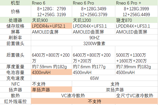 三款机子中比较要注意的是,OPPO Reno 6屏幕是直屏,且不支持NFC、单扬声器,而其实的都是曲面屏,具体对比图如下: