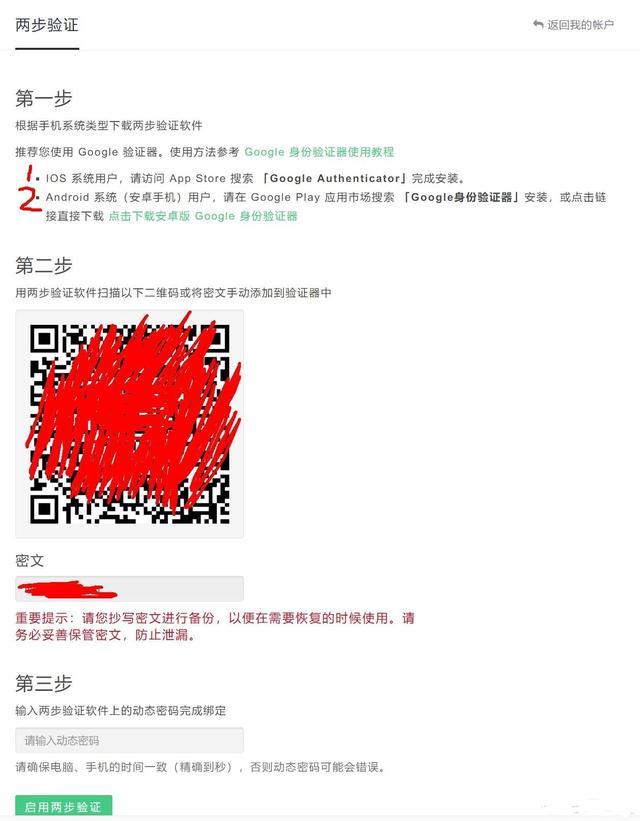 实名验证通过后,开始进行两步验证,这个时候需要下载谷歌身份验证器,这是一个类似动态密码的东西,以后的每次交易都需要用到。