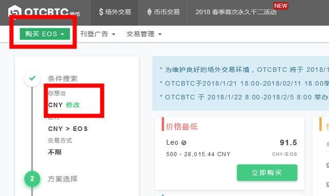 直接点击左上角EOS,然后选择条件搜索,你也可以点击修改来改你的搜索条件。CNY就是人民币,这里就是用人民币买EOS,交易方式可以选择微信、支付宝、银行账号等。