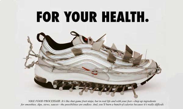 看到这双插满刀片的 Air Max 97,应该不会有人会把它和健康联系在一起。从外观来看,健康暂且不说,你可能甚至看不出一丝友善的影子——表面插满了刀片、鞋子的周围圈着铁丝、原本的气垫插满了钢钉。可是 Ava Nirui 把这只 Nike Air Max 97 称做:“耐克食物处理器(Nike FOOD PROCESSAIR)”。在 Ava 和 Alex 看来“这就像现实生活中用脚玩的水果忍者。把水果切碎,然后用来做果昔、果酱、烧汤,做成什么都可以。此外这样还能燃烧你的热量,用脚切水果可比用手切难太多了。”