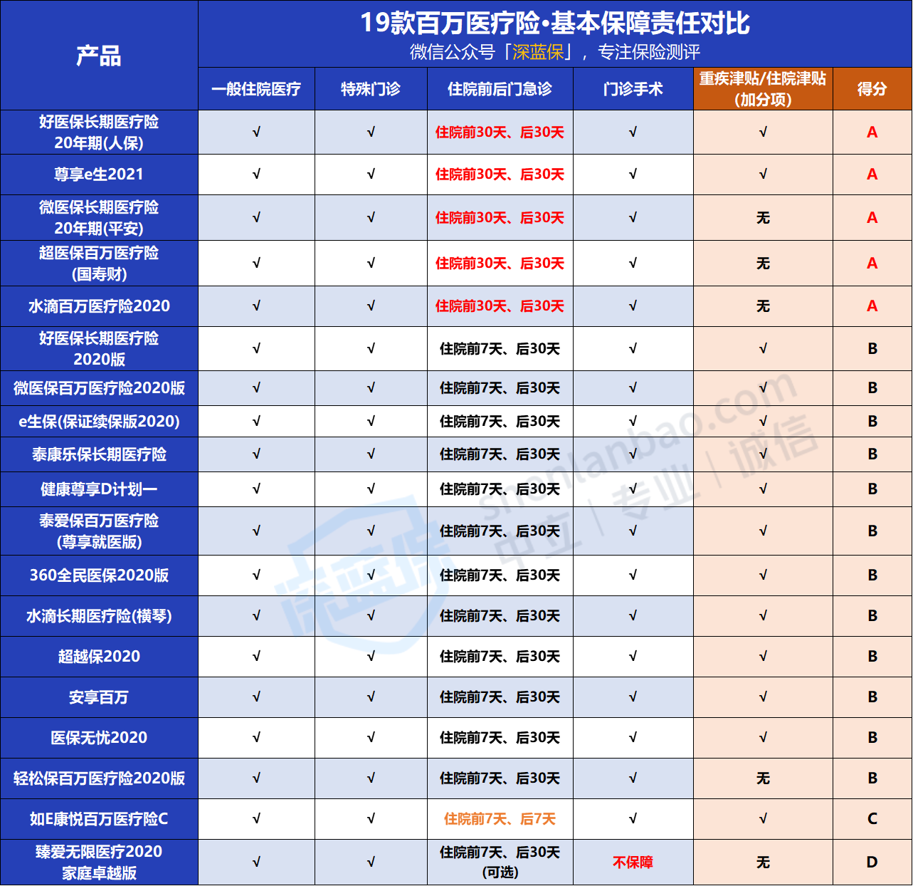 从上图可见,支付宝好医保20年期、众安尊享e生2021、腾讯微医保20年期、水滴百万医疗险、超医保百万医疗险充分涵盖四项责任,并且住院前后门急诊为前30天后30天,得分评级为A;