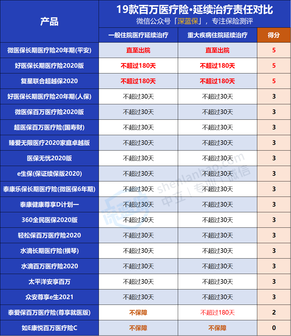 ①微医保长期医疗险20年期。这款百万医疗险的延续治疗可以一直保障至被保险人办理出院,非常贴心,果断给5分;