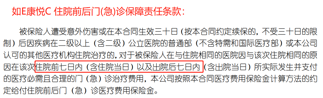- 常见的住院前后门急诊是保障前7天后30天,比如支付宝好医保2020、复星联合超越保2020、平安e生保保证续保版等。