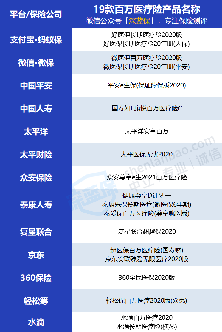 可以看到,进入测评环节的这19款百万医疗险产品,既有支付宝好医保、微信微医保这类国民级网红产品;