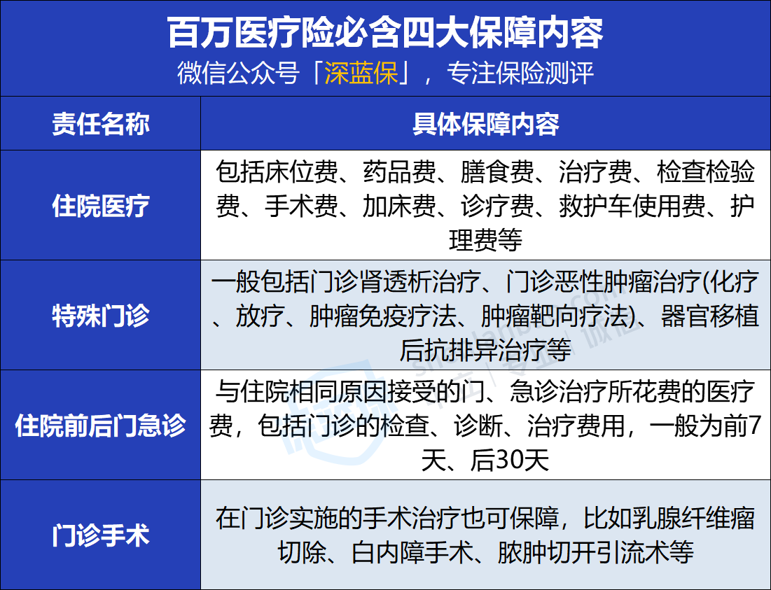 正常情况下,这四项保障是所有百万医疗险都必须涵盖的。