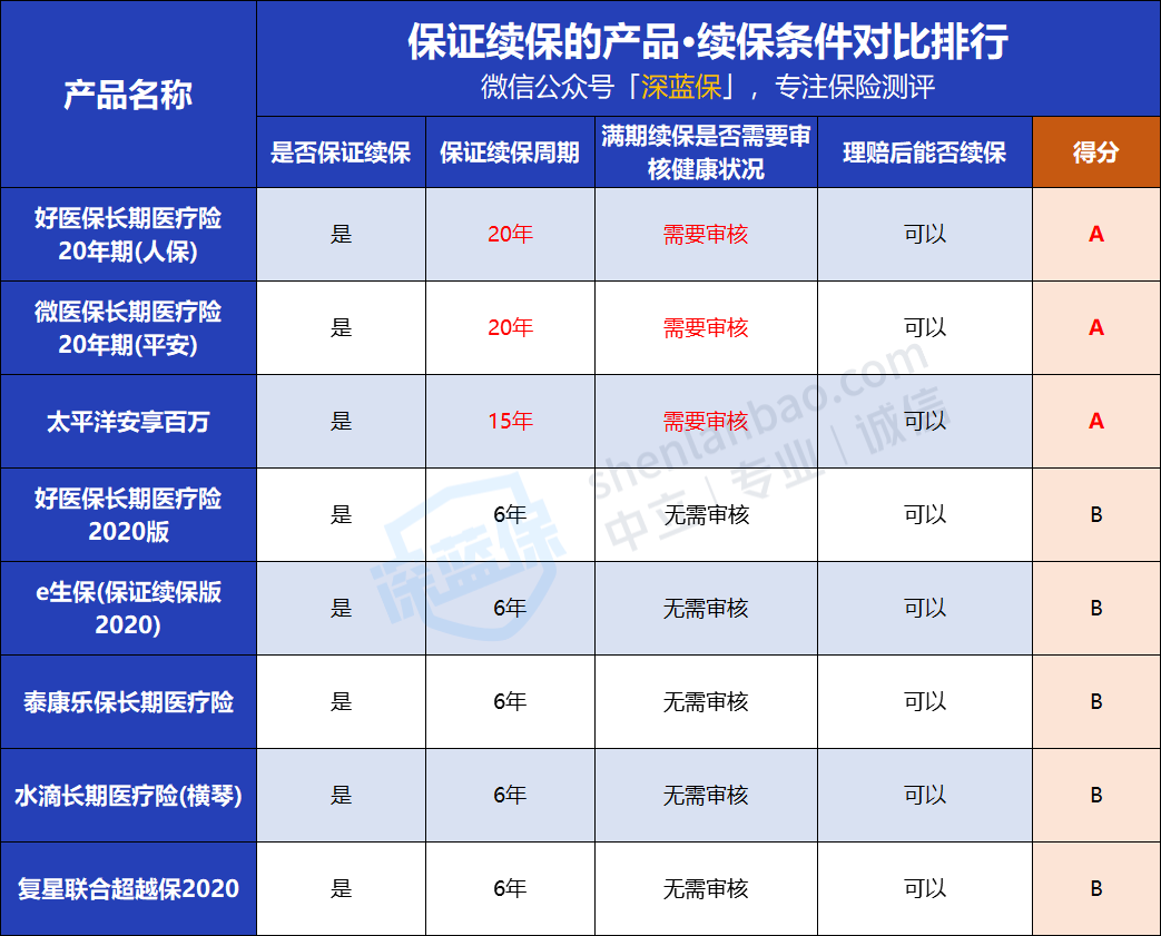 6年保证续保:好医保2020版、复星联合超越保2020、平安e生保保证续保版、泰康乐保长期医疗、水滴长期医疗险等;