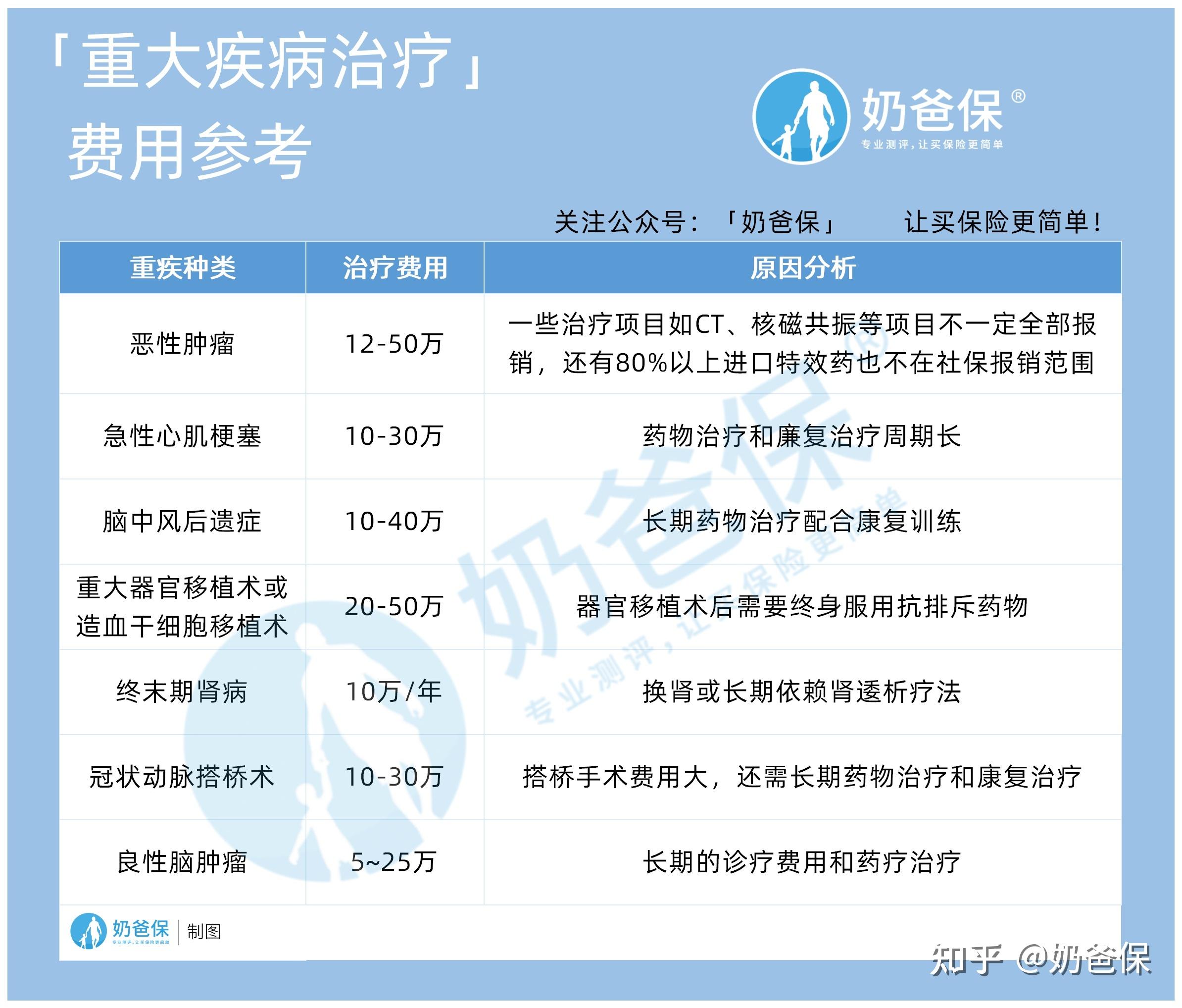 根据这些现实状况,再参照目前的医疗费用水准,尤其是重大疾病中发生率最高的几种。奶爸建议,重疾险保额至少30万起步,有条件可以做到50万甚至更高,最好能覆盖3-5年的家庭开支。