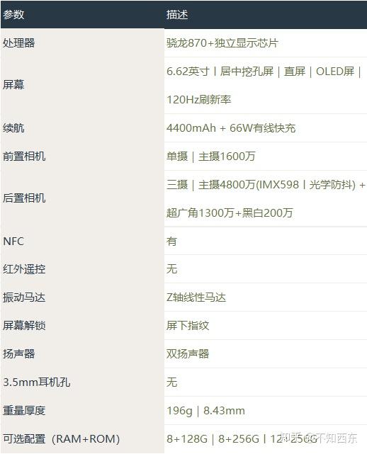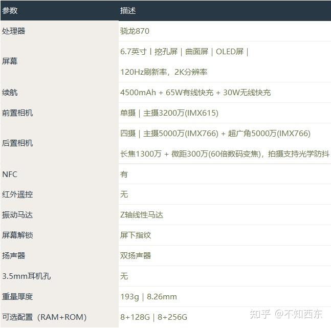 - 性能参数上,搭载骁龙870+LPDDR4X+加强版UFS3.1,综合性能强,处于第一梯队