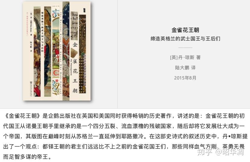 还有看了勇敢的心,权力的游戏当然要读金雀花王朝;玩了这么多年的日本游戏怎么能不了解大名鼎鼎的本能寺之变;明明是历史类书籍写的却像谍战小说,描写阿拉伯,中东风情的阿拉伯的劳伦斯;从外国人的视角解读近代天平天国战争的历史天国之秋