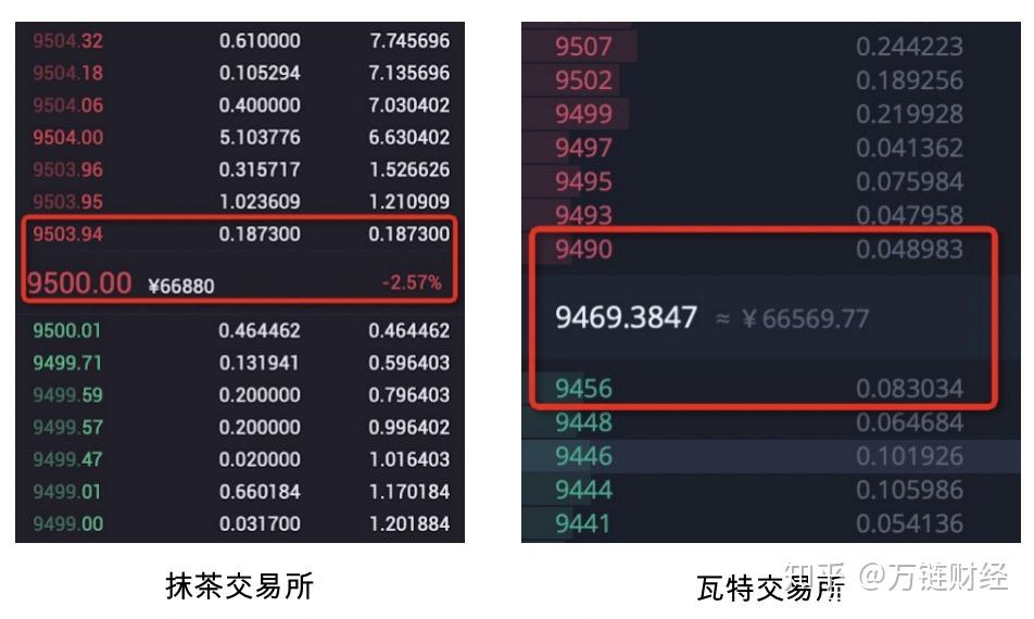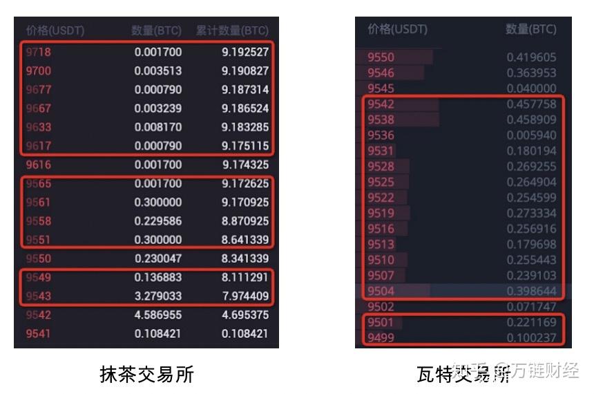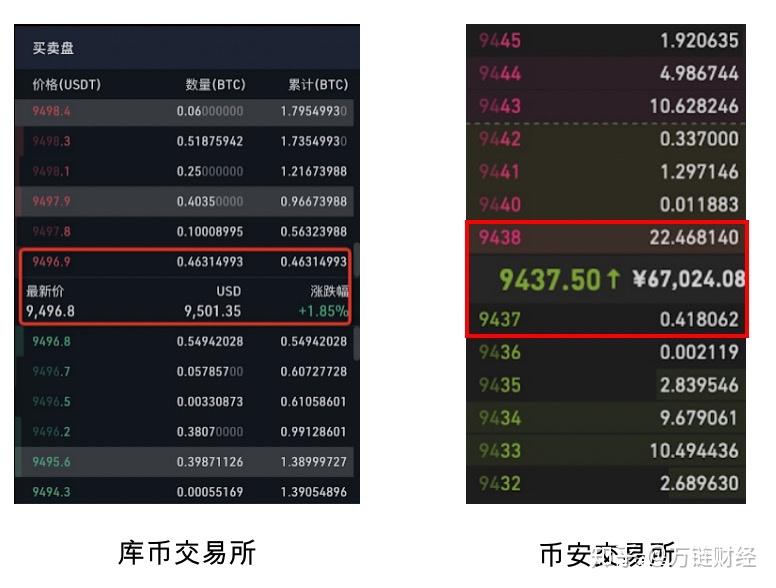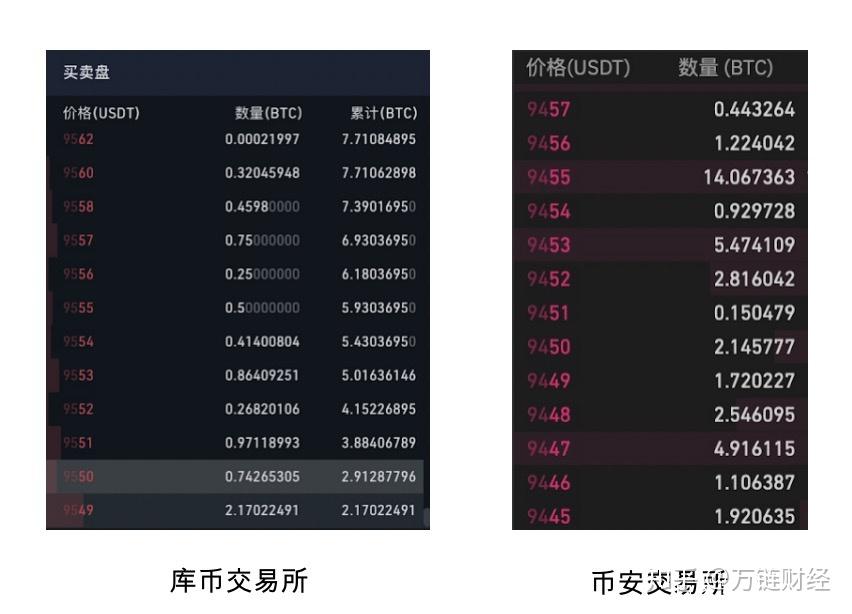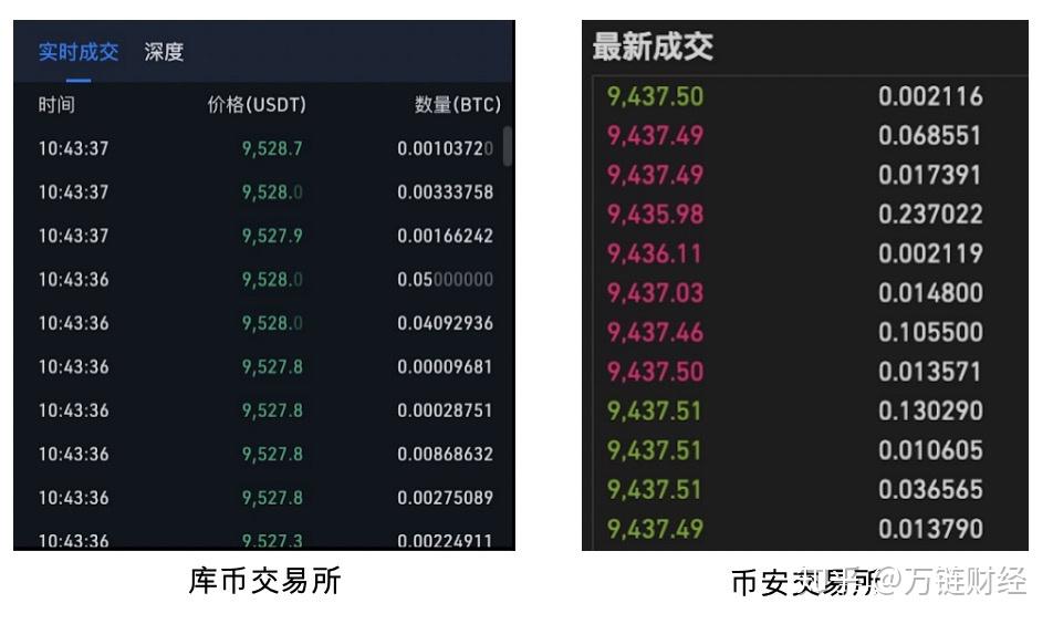 在下图中,抹茶和瓦特交易所的实时成交中存在价格跳空,如图中标红的部分,从9416跳到9428、从9454跳到9456等。而库币和币安交易所的价格非常平滑。所以库币和币安的流动性明显更好。
