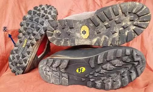 首先看外观,重点是鞋底花纹的走向。绝对不能是同一个形状或者朝同一个方向分布,否则野外行走时鞋子的摩擦力必然不足。