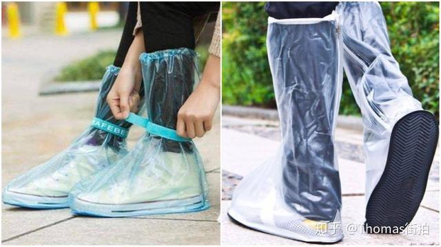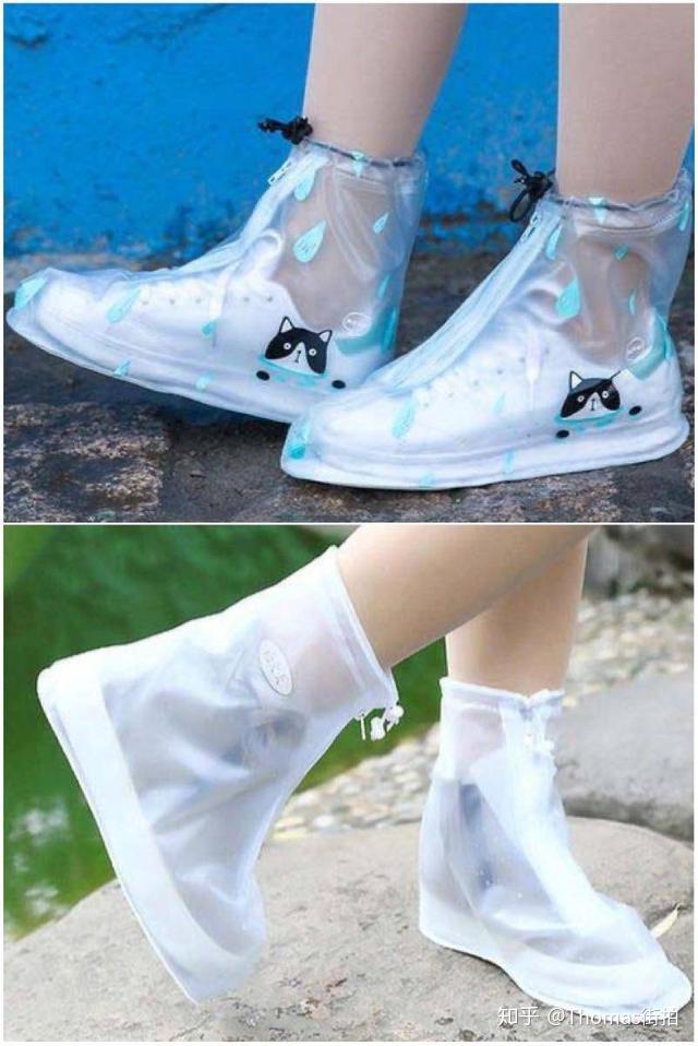 雨水和鞋子隔着一层透明的防水和防脏的鞋套。