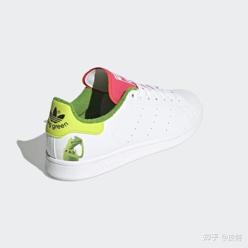 这款网球运动鞋由白色的皮革制成,鞋面和鞋带也是白色的,尾部则是绿色,用「穿孔」代替了标志三条纹,并在侧面印上签名。