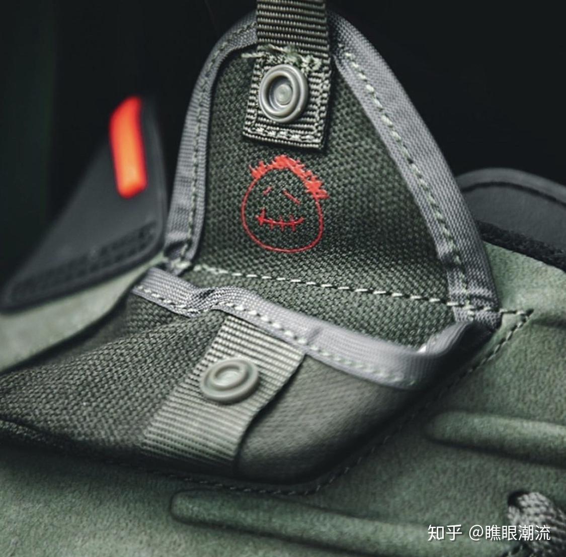 黑色鞋舌,夜光大底,中底内部以及后跟处的桔红色点缀。在色调搭配上使球鞋军事风十足,又不失时尚感。
