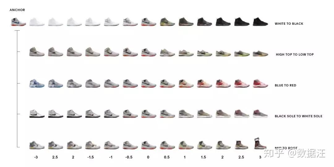 隐因子探索,每行使用相同的锚定潮鞋,每列是重构的隐向量的修正值,先验是标准正太分布