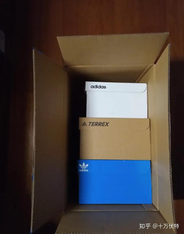 下班一回到家,就迫不及待地拆开了快递,只见里边白褐蓝三色的鞋盒依次静静躺在大箱子里,看来包装小哥也是个强迫症晚期。