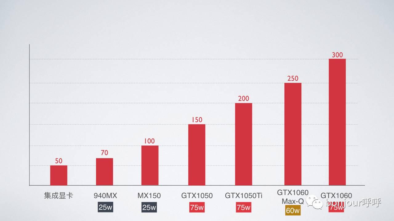 集成显卡不细分了,大约50分吧,940MX大约70分, GTX1050,150分,GTX1050Ti,200分,1060Max-Q,250分,GTX1060,300分。