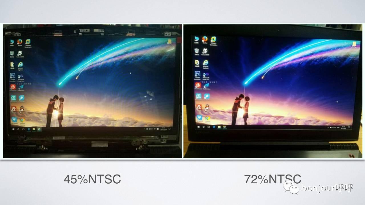 色域,这个我在手机的屏幕那期详细说过。但是目前的笔记本电脑,几乎没有使用oLED屏幕的,也不存在色彩过于鲜艳的问题。我也不啰嗦了,简单的来说,目前常见的是NTSC45%和72%的色域,效果差距也是挺大的。
