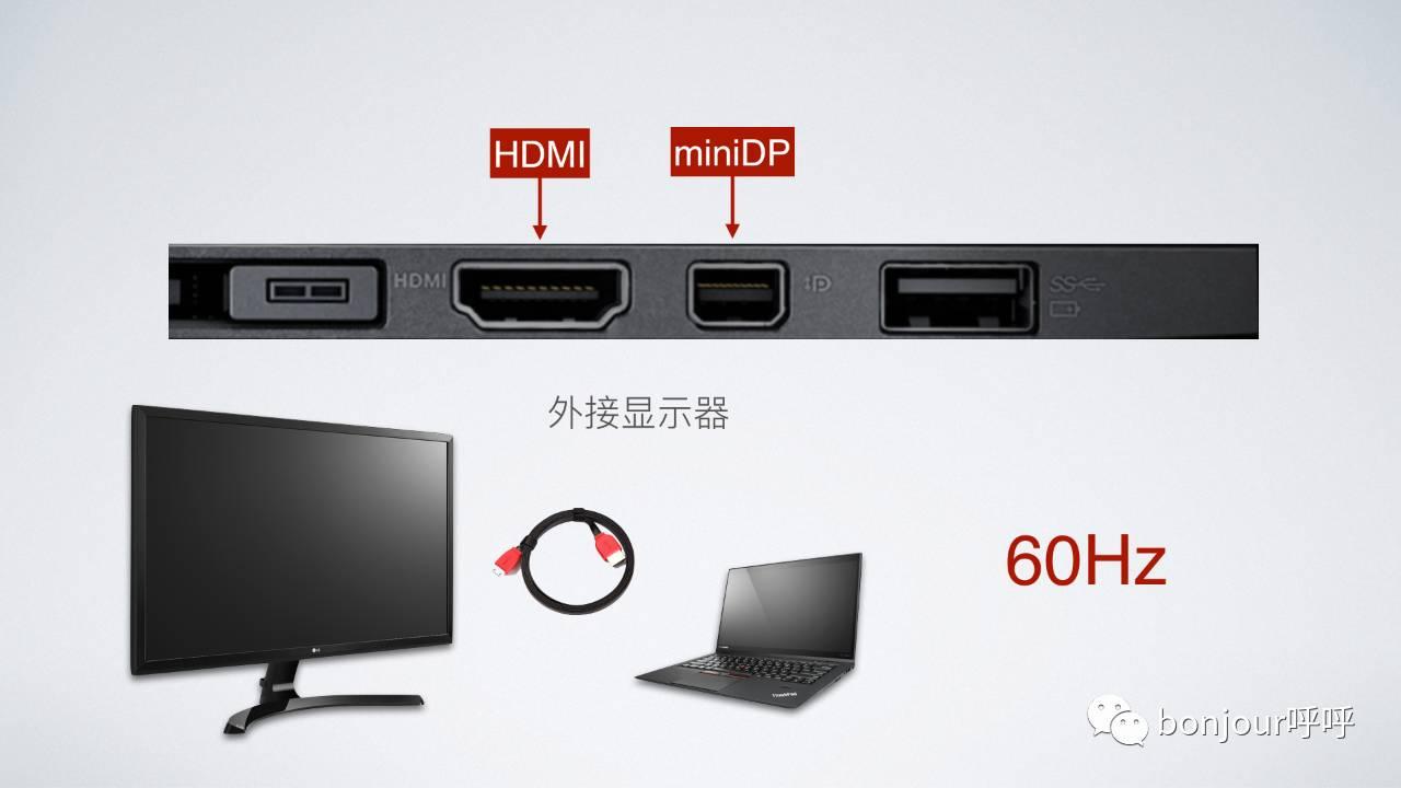 这里要说一下,外接显示器,对于显示器、笔记本、以及连接线都有要求,缺一不可,如果有这方面需求建议一定要详细的看各个说明书。注意,一定要支持60hz刷新率,30hz基本上是没法用的。