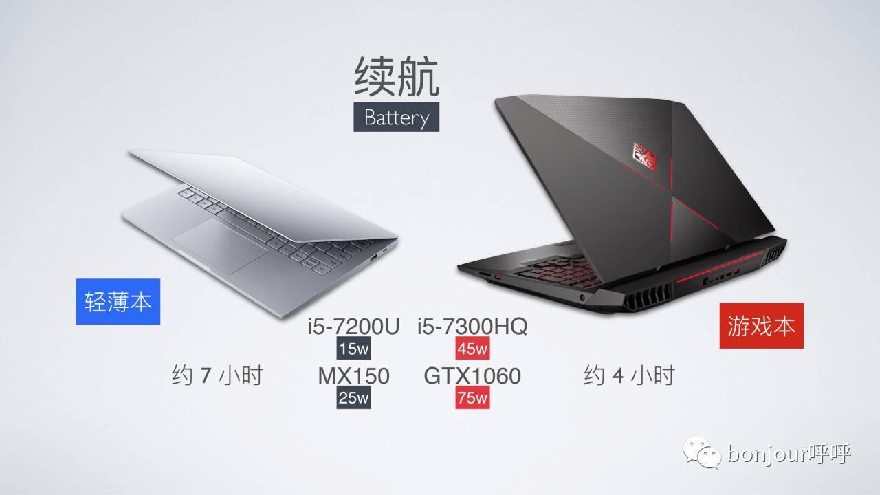 从CPU和显卡两个的耗电大户来看,很容易可以得出结论,轻薄本的续航比较好,标称一般都在10个小时,实际情况7个小时左右吧。游戏本的续航就比较差了,大约4个小时左右吧。