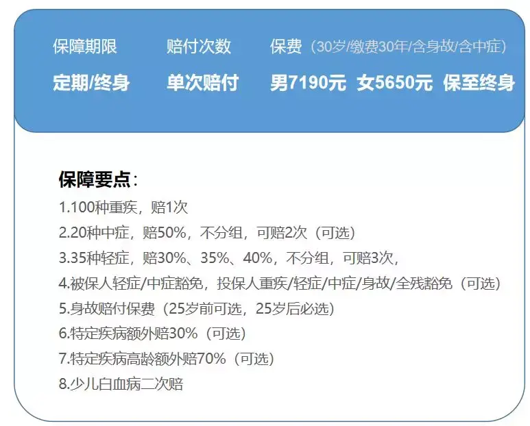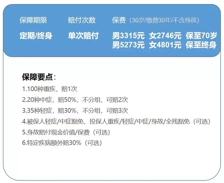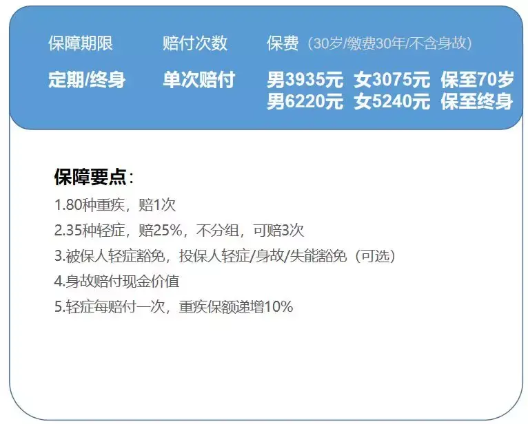 比如30岁的人,选择保到60岁,缴费至60岁,买50万保额,附加轻症,男性每年只要2190元,女性只要1680元。(但是总保费其实还是高的。)