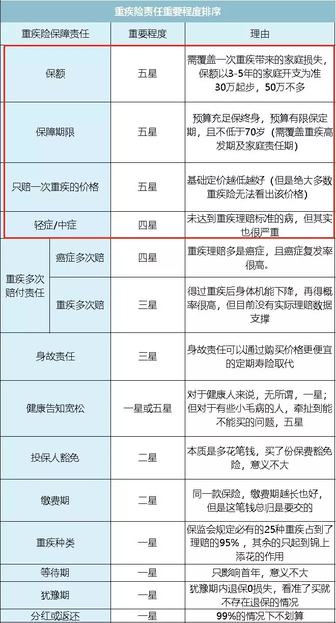于是,公子把重疾险的责任,按照重要程度从上至下排了个顺序: