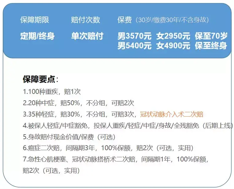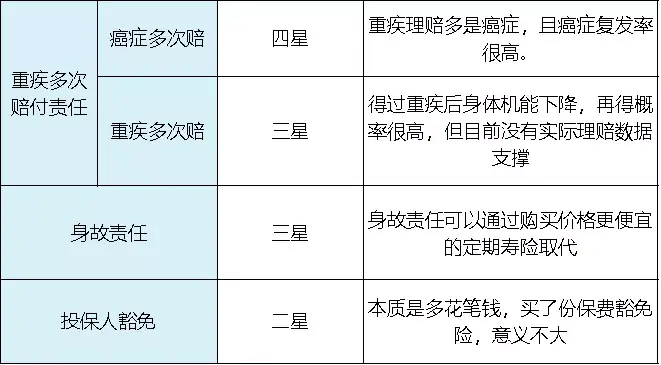 预算稍充裕,公子还是最建议加上特定重疾(癌症+急性心梗+冠状搭桥)多次赔的责任。