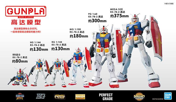 - PG (Perfect Grade)1:60,名字很明确了 Perfect(完美),追求对于机体细节的完美还原,因为机体更加的复杂所以是万代开发最长的一个系列,所以也有着比较高的价格门槛。