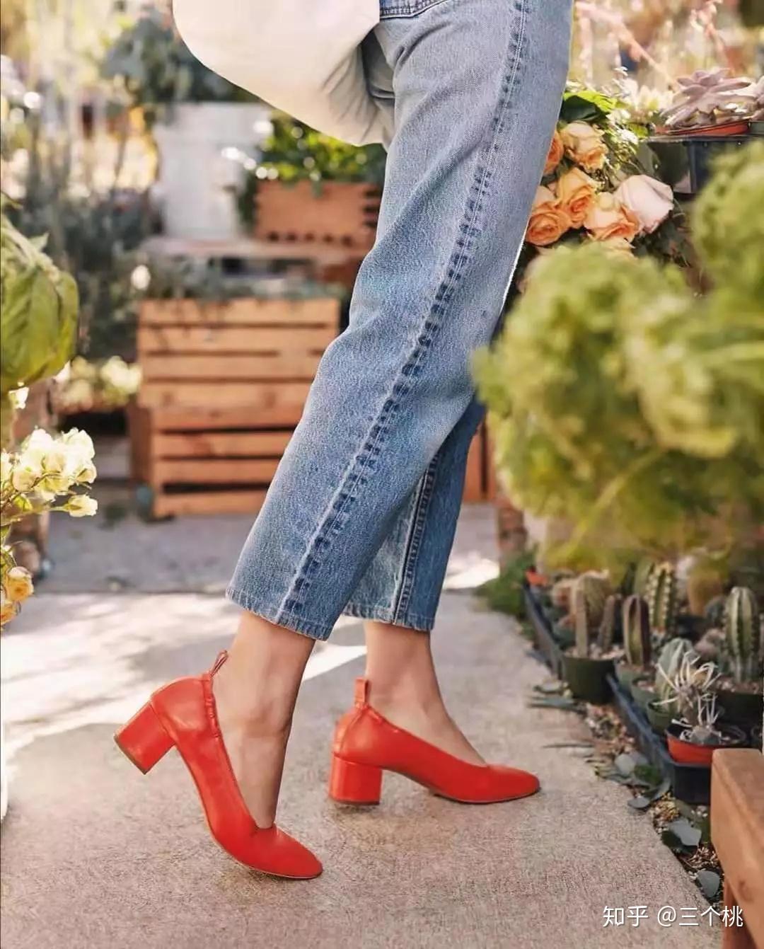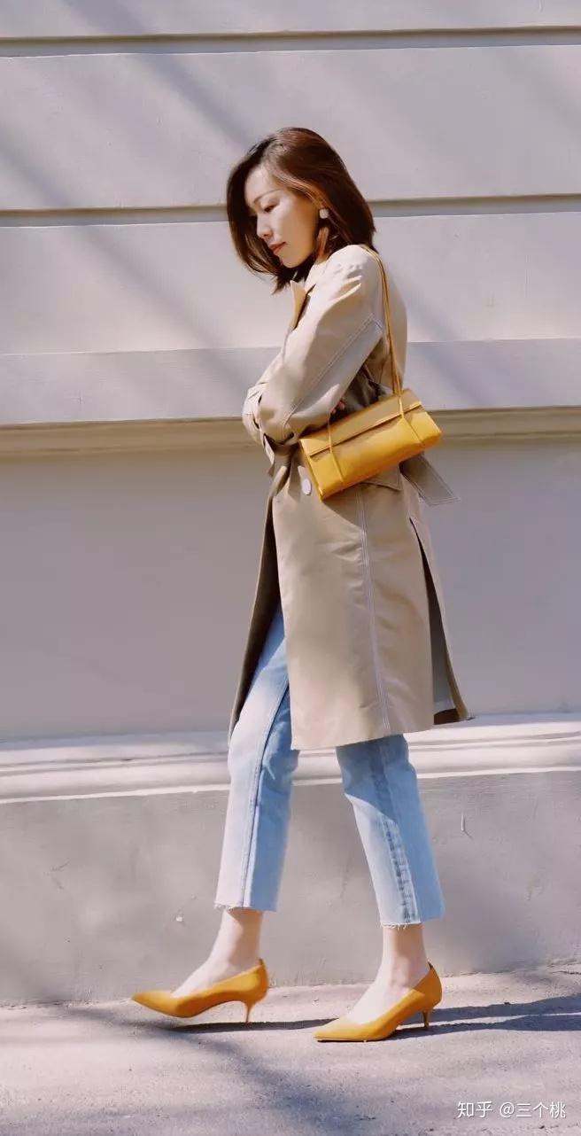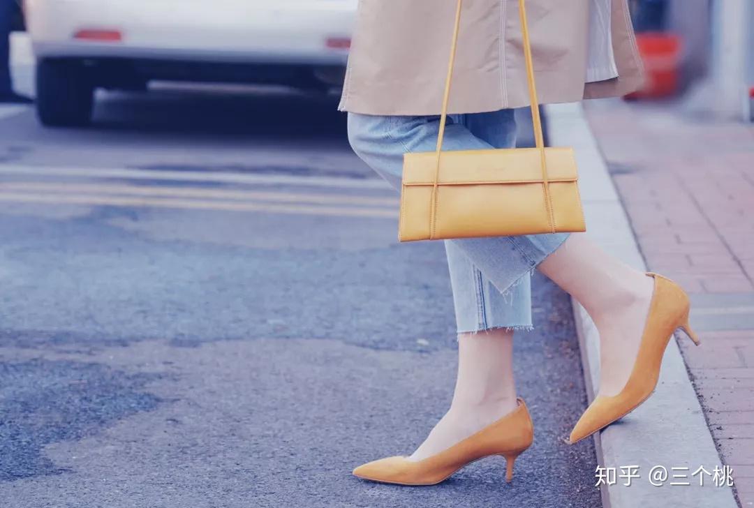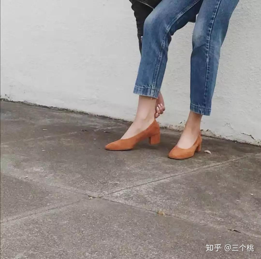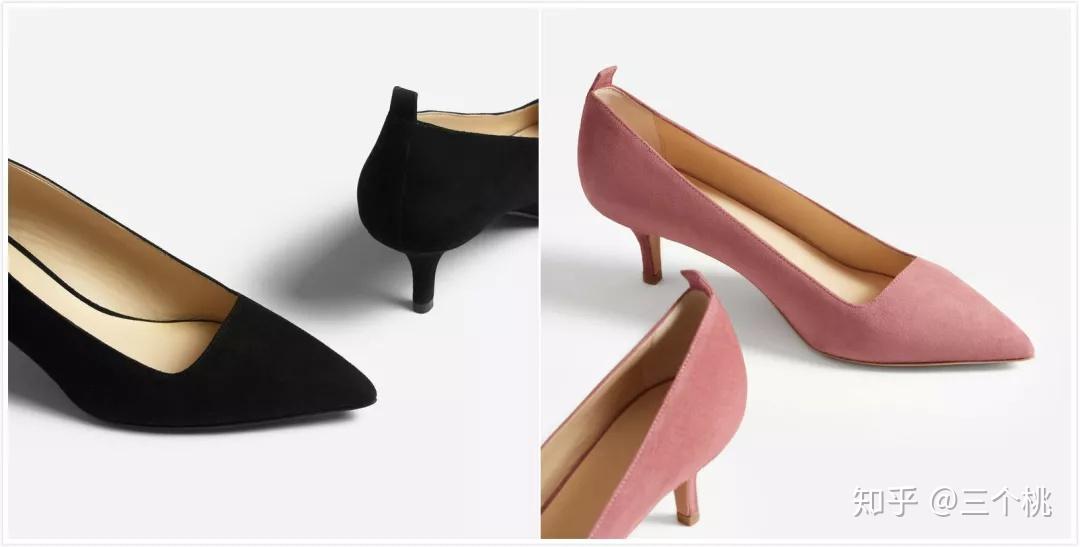 桃子在everlane买过一双姜黄色小猫跟鞋,就是开头那双。 皮质是绒面革羊皮,鞋跟大约5cm,鞋型是尖头,再加上浅口设计,看起来优雅大方又显腿长。