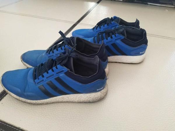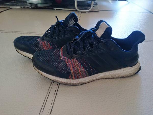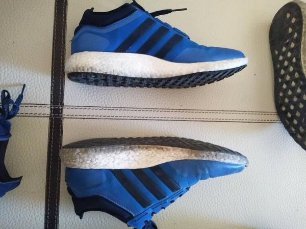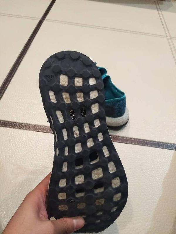 丑!但是实用,而且相对来说便宜。全掌的boost。脚感柔软,也就是你们所说的踩屎感浓郁,这个是我主要用的跑鞋,一起上过山,一起下过乡,一起扛过枪,一起........额,这个真木有。风里来雨里去,用了很久很久。买了两双,都是实体店买的正品。缓震比较明显,明显感觉跟硬底的不一样,跑起来很舒服。大概跑了600公里鞋底和大概跑了100公里不到的磨损程度如图。