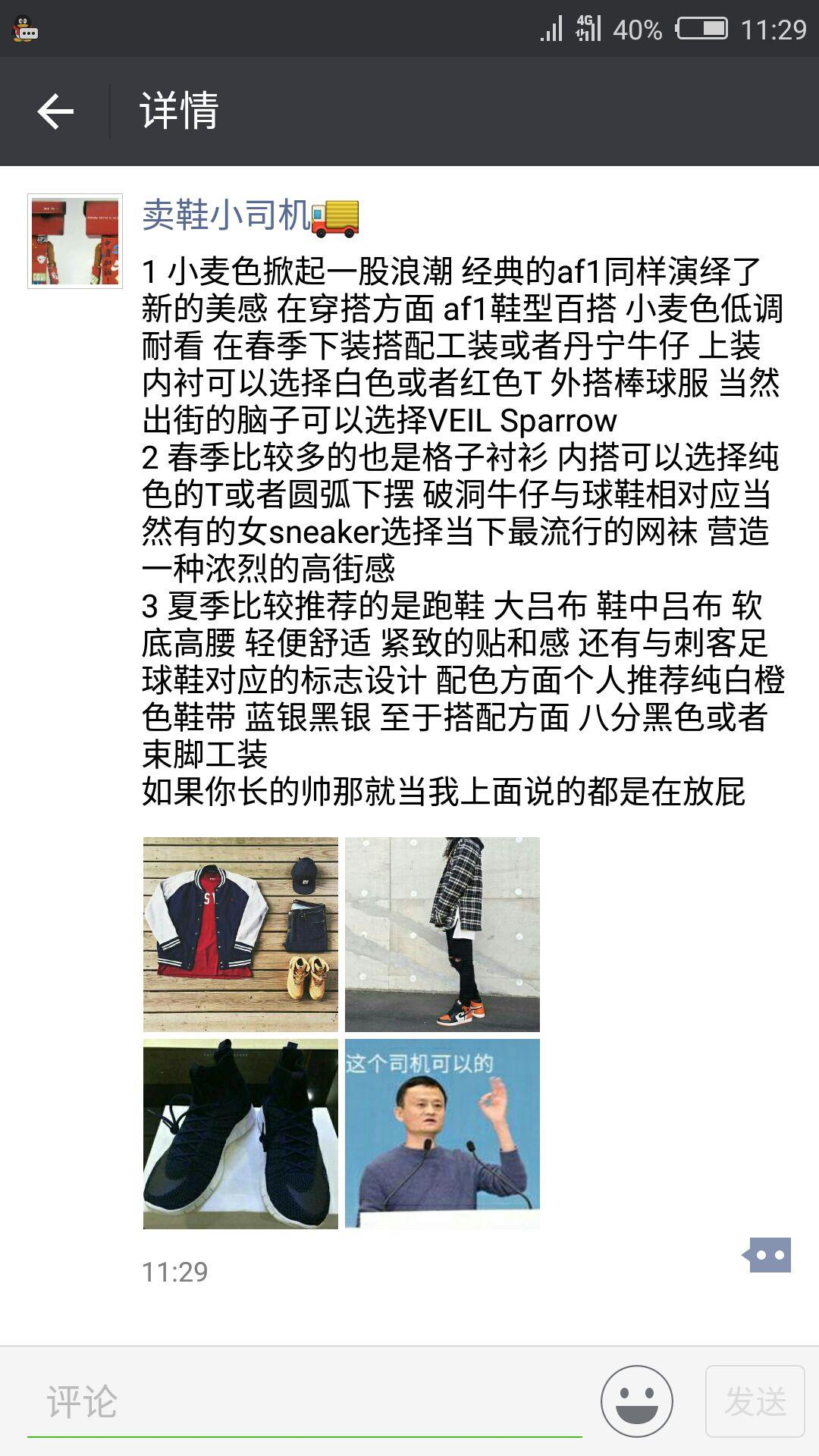 说了鞋子来说说另外一件事,假鞋,pt人民伟大,让全世界的人穿的起名牌鞋,然后呢穿的起然后呢?生活水平一路提高出门布加迪在内大别墅脚踩aj手拿水果机?我不反对假鞋,毕竟不是所有人都有足够能力买的起名牌都能像某某某一样享受快活人生,当没钱来满足出于内心的虚荣心的时候你选择高精品,没毛病,但我希望你选择性价比高的,这是为自己好,但是制造请收敛一点,真标真碳板?最高级别1:1复刻?一张普通车床想要创造boost踩屎和气垫的澎湃?那当Nike和Adidas的设计师何用?这是对产业对球鞋文化最起码的尊重。买不买假鞋,是个人价值观决定,也许等你有能力买的起一双高性价比的Nike你还是会毫不犹豫选择厂货,这就是价值观在心中逐渐生长。假鞋可以用来装逼如果是实战我觉得你还是选择水泥杀手,毕竟膝盖废了不是一双鞋子的钱就能恢复回来的。真的假不了假的真不了。别昧着良心把假鞋卖出真鞋的价格!想要买更好的鞋子就请努力工作好好学习!正如前面说的我是一个贩子(纯属小贩子)搞个批发搞点普货折扣好价aj或者实战,套现不接只接寄卖!平时偶尔做一下简单的球鞋修复和球鞋清理(最近在研究漆皮修复和去氧化有需要的可以找我交流),不定时自己写球鞋日常搭配和球鞋评估。像前面提到的Kobe ad确实能拿到货很好,偶尔能拿到三位数的真蓝或者31。拿不到调货我也只是混凝土的搬运工,学生党工作党买鞋不容易都知道,别人650到付我给你649包邮别人650包邮我给你630顺丰,一单一笔钱一个朋友,挣得是问心无愧的钱挣的是你情我愿的友谊。空间两个原则:1.只卖鞋2.不碰假 最后上几张朋友圈的截图吧