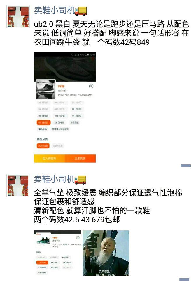 好了,发个朋友圈招来三个人,有人报价650到付,有人699普快,有人750包顺丰,同一双鞋子啊,拿个图背景都一样的。。。