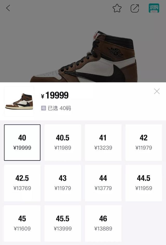这双Travis Scott x Air Jordan 1借着在Travis Scott在格莱美表演时进行了突击发售,货量极少,导致这双鞋在国内轻松破万,部分尺码价格更是达到两万。