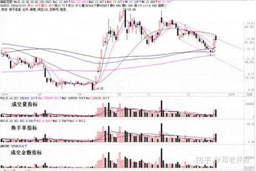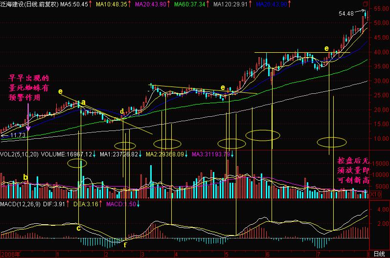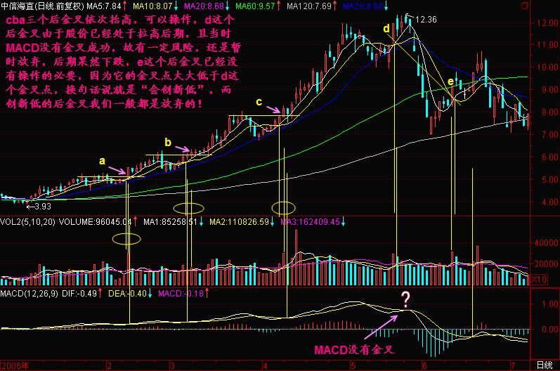 广通技术中有一个著名技术叫后金叉买入。它讲的是什么呢?它讲的是,如果你在三死叉的时候出货了:如图a点是一个5日、10日均价线死亡交叉,b点是5日、10日、20日均量线死蜘蛛,c点是MACD死亡交叉,这就构筑了三死叉见顶的信号,这足以使我们感觉不妙,先退出来再说。退出来以后,我们就等待出现比较明显、大级别的5日、10日均价线金叉(图d点),MACD金叉(图f点)和成交量5日、10日均量线金叉,也就是等待三金叉见底信号。对于一般的股票来说,三金叉出现意味着股价出现一个低点,起码也是阶段性或短期的低点,而对于庄股来说,如果三金叉不买进就等于踏空。
