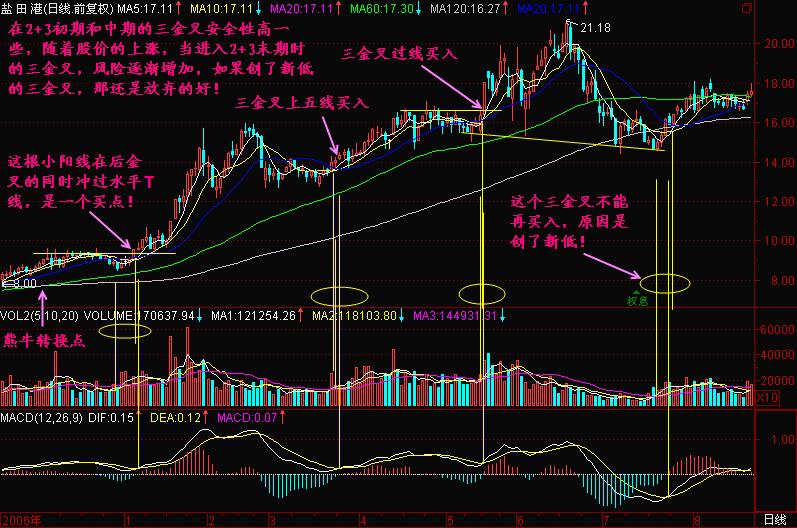 三:后三金叉更稳定,价金叉、量金叉、MACD金叉同时或相继发生的后金叉更好;
